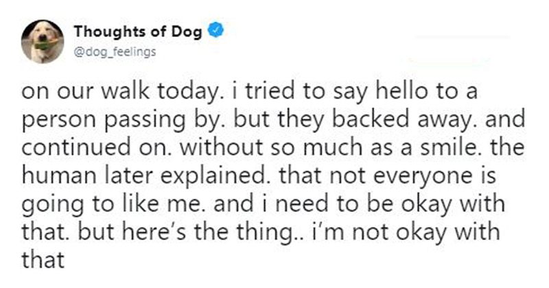Thoughts of dogverified account at dogfeelings sep 3. A dogs stream of consciousness shared in the form of perfectly misspelled tweets. But to come out.